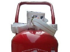 該滅火器主要由筒體、器頭總成、噴管總成、車架總成等幾在部分組成,滅火劑為碳酸氫納(ABC型為磷酸銨鹽)干粉滅火劑,驅動氣體為氮氣,常溫下其工作壓力為1.5MPa。