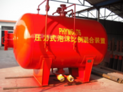 壓力式泡沫比例混合裝置主要由帶膠囊的泡沫液壓力儲罐與利用文丘里原理制成的PHY型壓力式比例混合器組成,當系統管網中的水流經比例混合器減壓孔板時,在孔板的前后會形成壓差。壓高處的一部分水(3%或6%)通過泡沫罐的進水管進入罐內,擠壓膠囊,將膠囊中的泡沫液通過泡沫罐的出液管擠壓至比例混合器低壓處與水混合形成泡沫混合液,形成的泡沫混合液輸出到泡沫產生設備(中、低、高倍數泡沫產生器,泡沫槍,泡沫炮等)與空氣混合產生泡沫滅火。