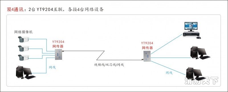 數(shù)字網傳器YT9204是通過微差分原理實現(xiàn)在同軸線上傳輸網絡信號,可一條線傳4個網絡攝像機信號無延時,無損耗。設備具有對稱雙功作用,網絡信號雙向傳輸。