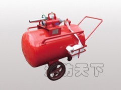 本裝置采用推車形式,在火災發生初期時,機動、靈活地推動該裝置到滅火現場進行滅火。本裝置可獨立作為消防防衛器材,也可配合大型固定式泡沫滅火系統起輔助補救作用。該移動式泡沫滅火裝置可由消防管網或城市供水管網、消防車、手抬消防泵提供壓力水源,經負壓比例混合器按一定的比例(3%或6%)與泡沫貯罐內的泡沫液形成泡沫混合液,再通過空氣泡沫產生器形成泡沫噴出滅火。